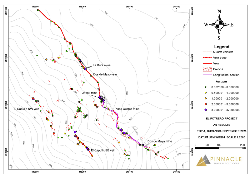 ‘We are extremely pleased with how the combination of underground and surface sampling is coming together to define a strong, well-defined and high-grade vein system at El Potrero ,’ stated Robert Archer, Pinnacle’s President & CEO. ‘On the Dos de Mayo trend, the higher silver grades at surface continue to suggest there may be some vertical zonation, with silver increasing upwards. As one moves uphill to El Capulin, the continued presence of gold-silver mineralization up to 1720 masl infers that mineralization here could extend downwards to similar levels seen on the Dos de Mayo structure, or a vertical distance of approximately 200 metres. These observations are consistent with low sulphidation systems in the Topia District and elsewhere in Mexico and bode well for the potential to develop significant zones of mineralization.’